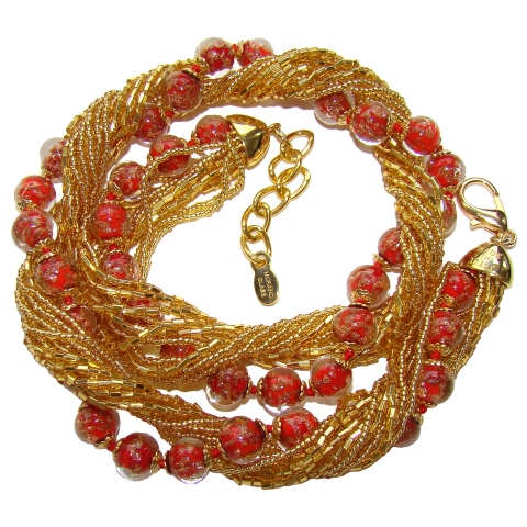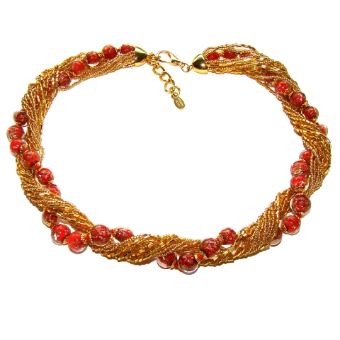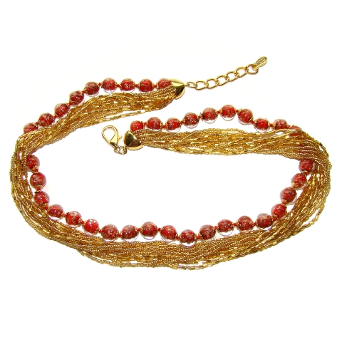 est composé des Perles rouges avec feuilles d'or et de 12 rangs de petites perles en verre de Murano, ce magnifique collier peut se porter de plusieurs façons.