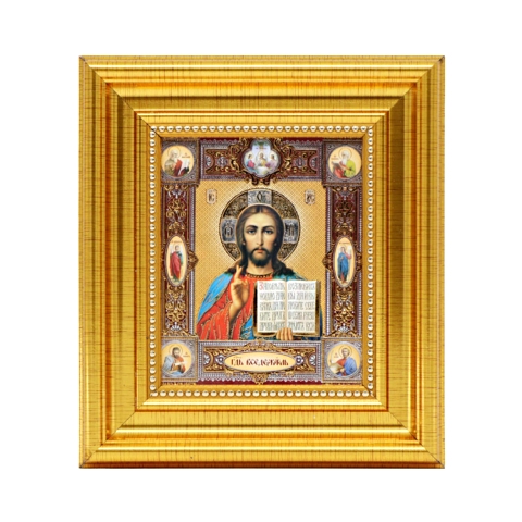 Icône du Christ Sauveur avec un relief complexe estampé, ce qui lui donne un aspect festif. Les saints sont représentés sur les marges de l'icône.