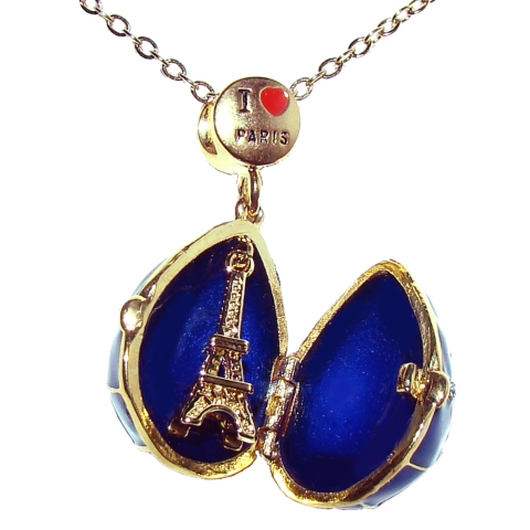 Très original pendentif en forme d'oeuf - I Love Paris. L'oeuf en email bleu est décoré par les strass et montée sur une chaîne en métal doré. Les deux faces de pendentif sont décorées. L'oeuf surprise s'ouvre, la breloque est la Tour Eiffel.