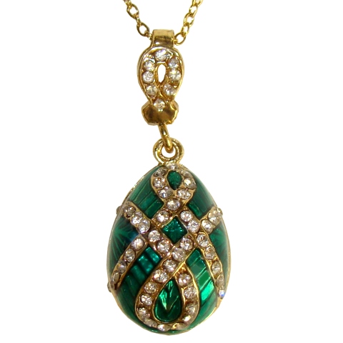 Ce Pendentif oeuf fabriqué en alliage doré recouvert d'émail vert, décoré par les strass