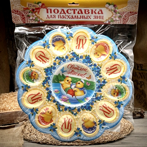 Présentoir de Pâques ХВ ( Christ est ressuscité en russe ) orné des images des Poussins, avec de petites alvéoles pour 12 œufs et un plus grand pour le gâteau de Pâques ( Koulitch ). Avec ce présentoir porte oeufs coloré, vous pourrez facilement décorer votre table de Pâques !