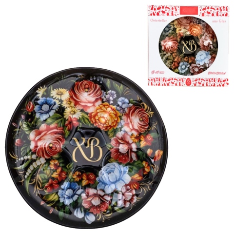 Présentoir de Pâques en verre orné d'image des fleurs, avec de petites alvéoles pour 6 œufs, dans une boîte cadeau.